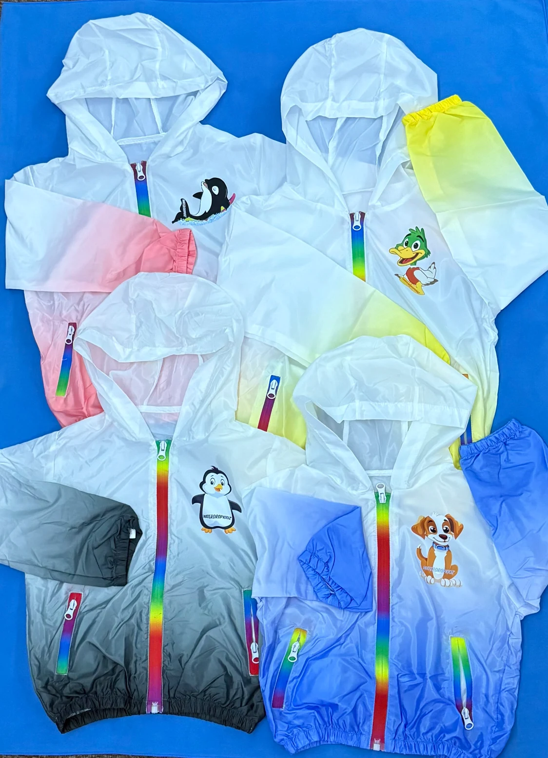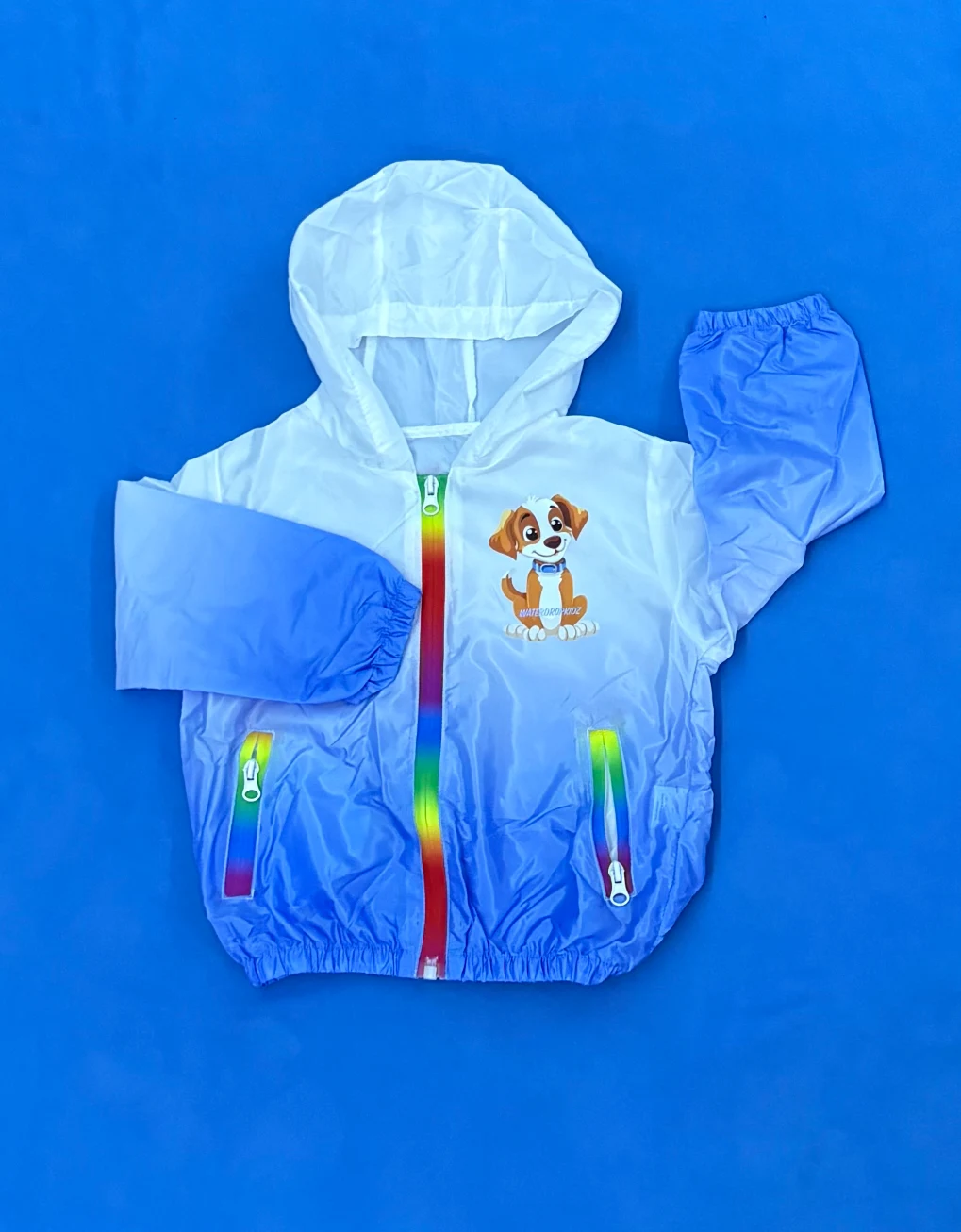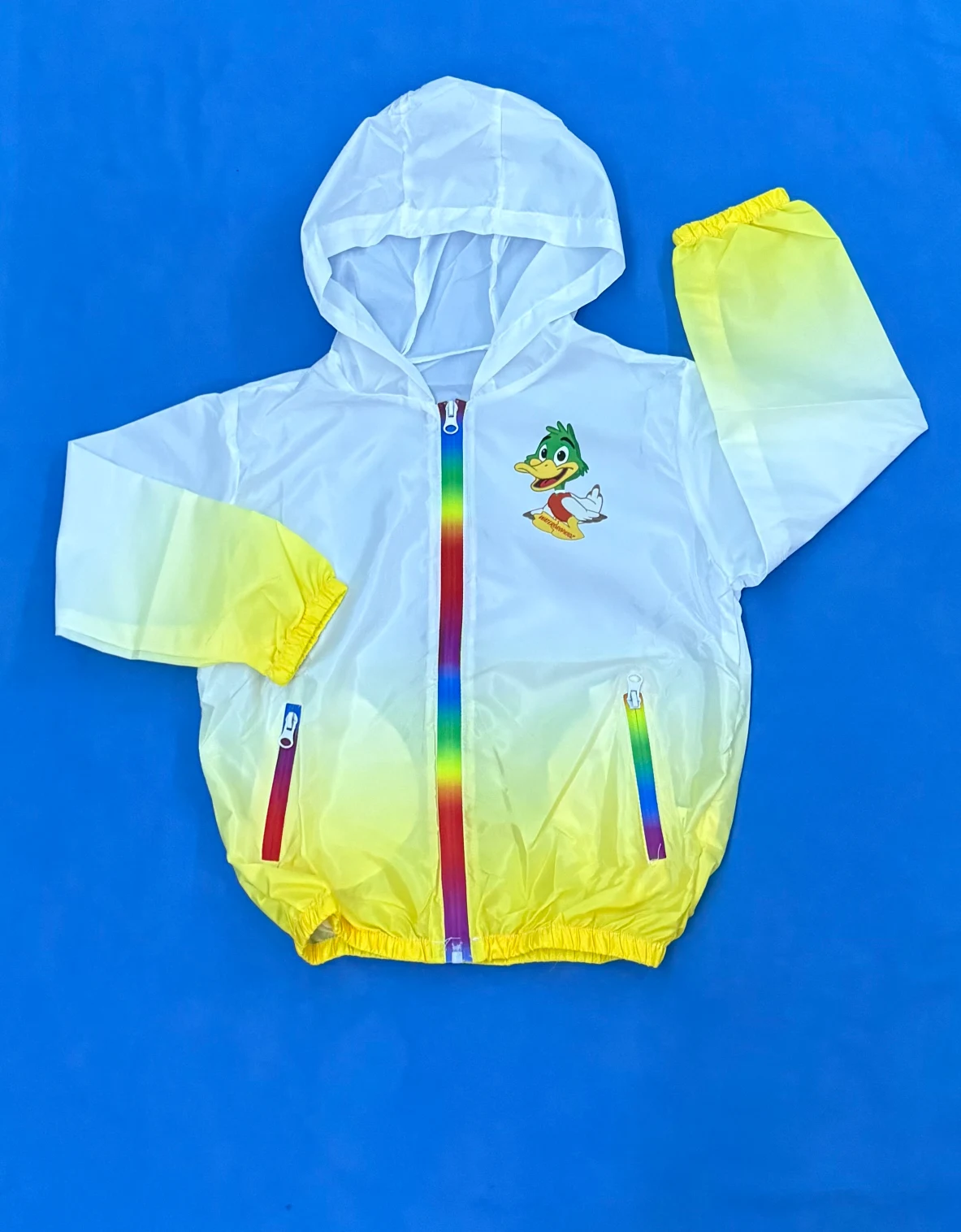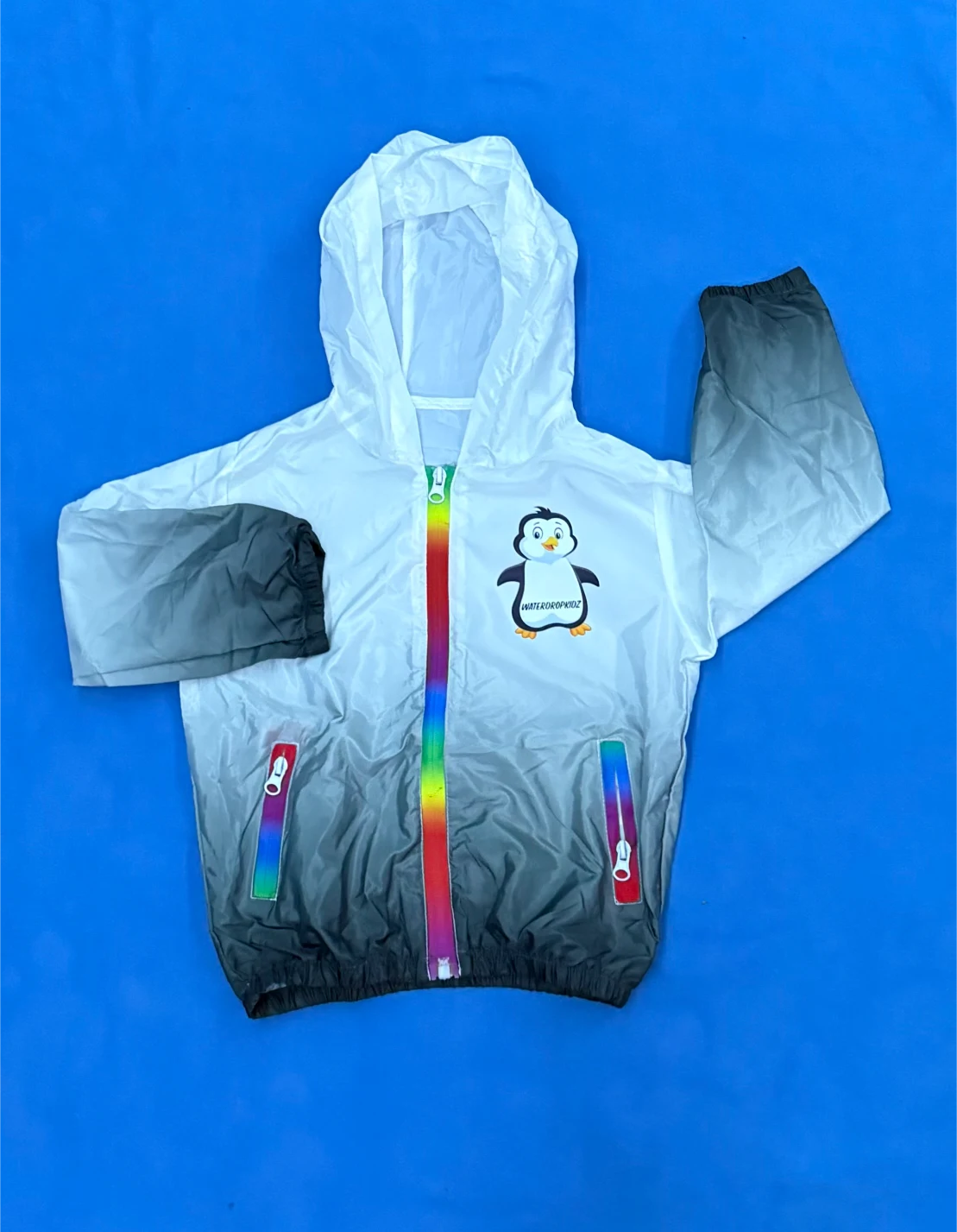 Great everyday hooded waterproof jacket that is durable and easy to wear with gradient colours and rainbow zipper.
